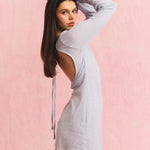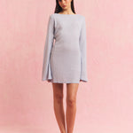 Strikket kortkjole med dyp åpen rygg og tynne knytebånd som krysser øverst. Lange flared ermer som svinger ut nederst. Lett, åpen strikk med liten texturert noppe-effekt – luftig og feminint, faller pent over kroppen uten å være trang.