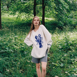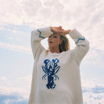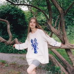 Den chunky, oversized silhuetten gir en leken og lun look, mens det blå hummermotivet i front skaper et maritimt uttrykk.