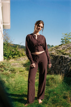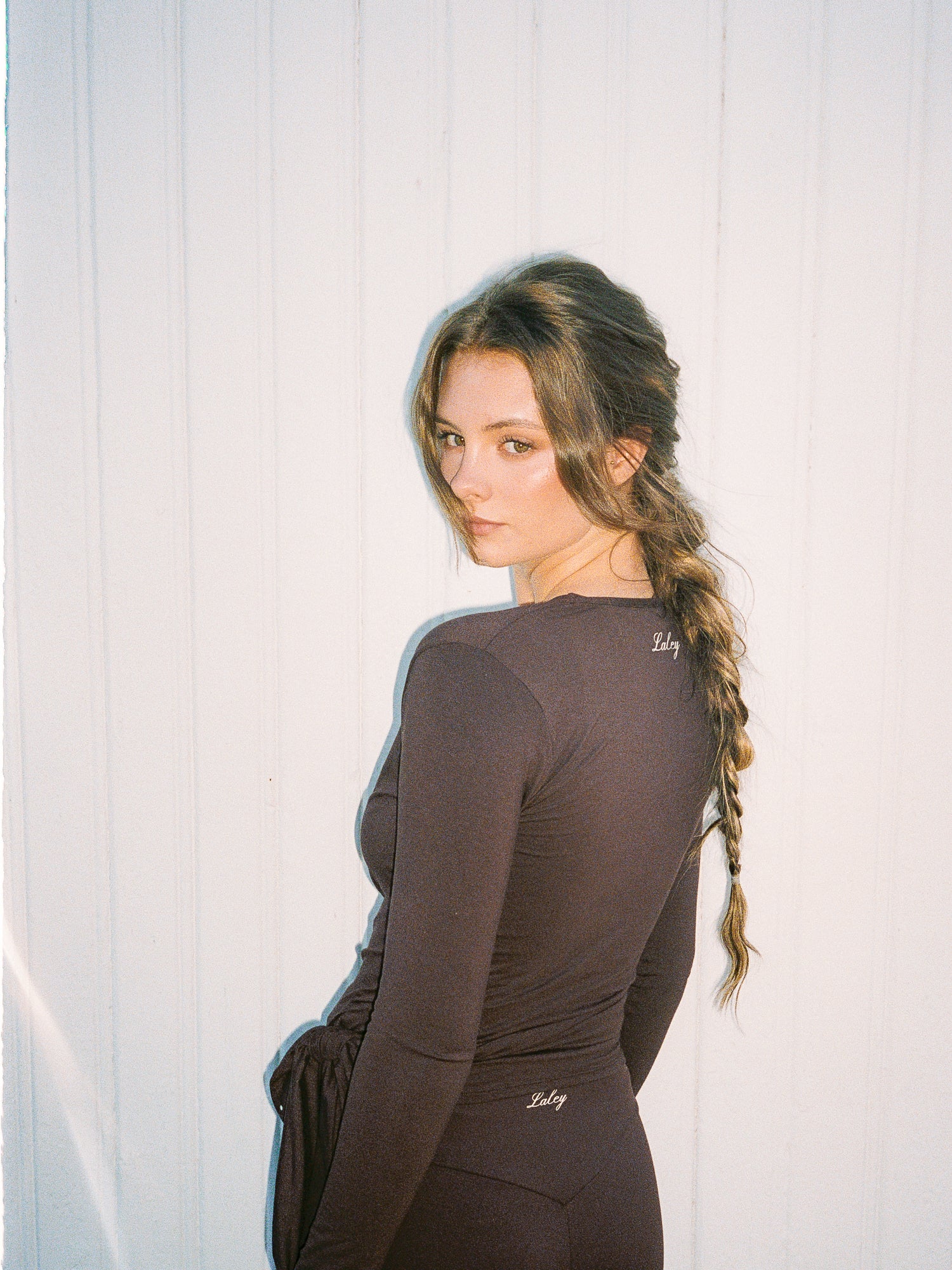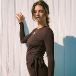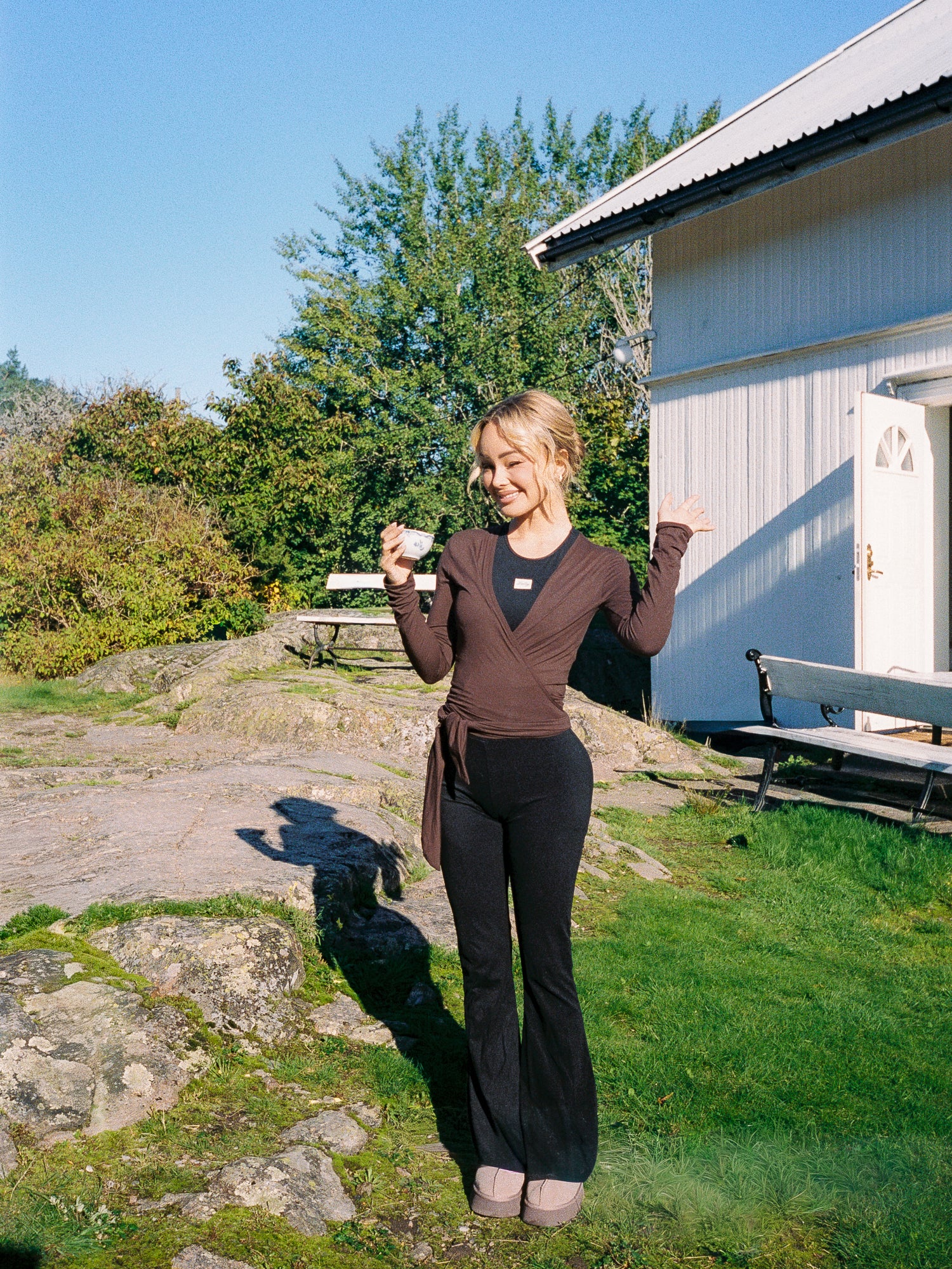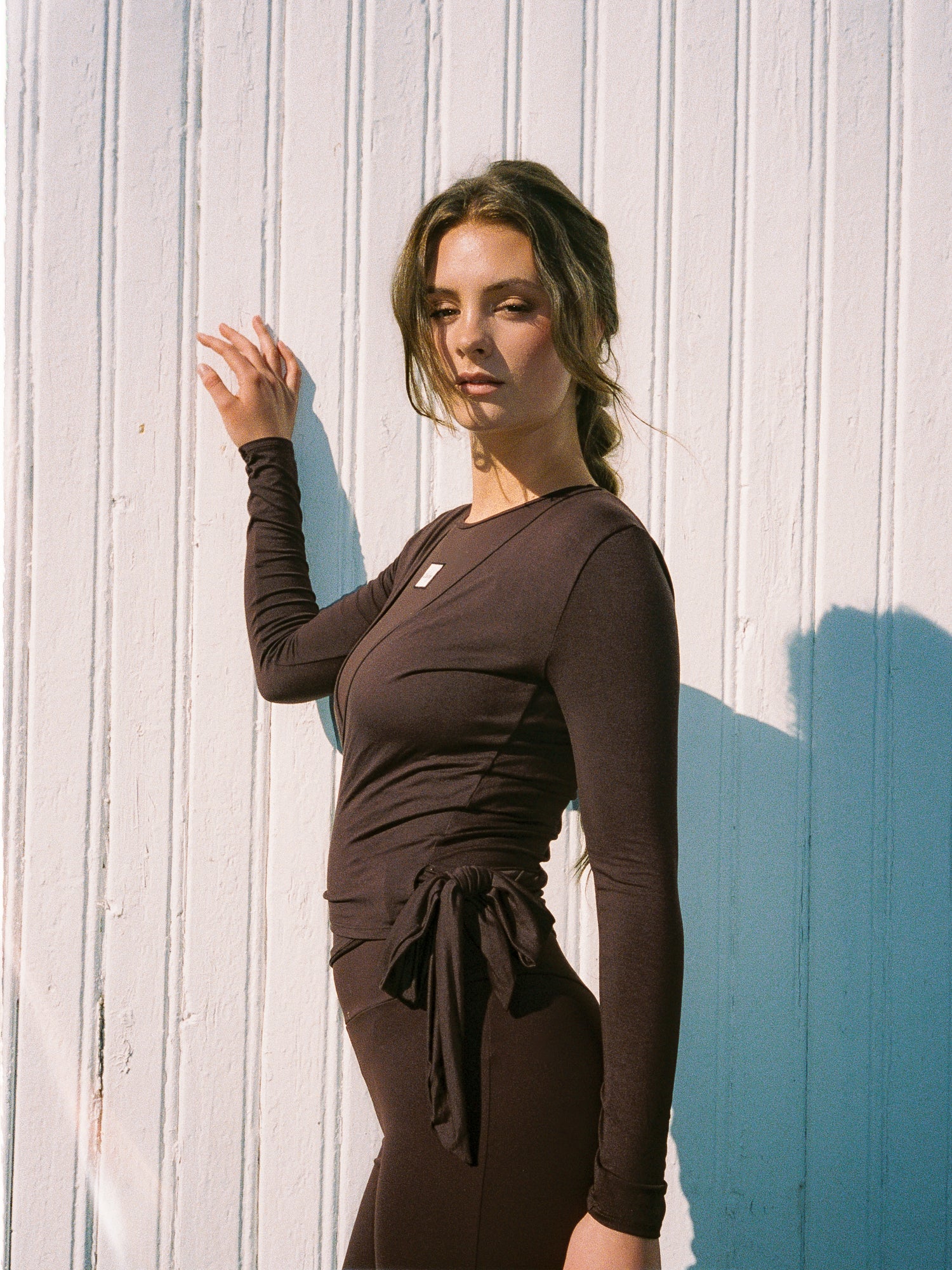 Ballerina Top er laget i en myk og lett miks av modal og elastan, som gir en glatt og behagelig følelse mot huden. Den har et flatterende, kryssende snitt foran som knytes i midjen for en feminin og fleksibel passform.