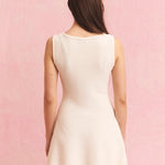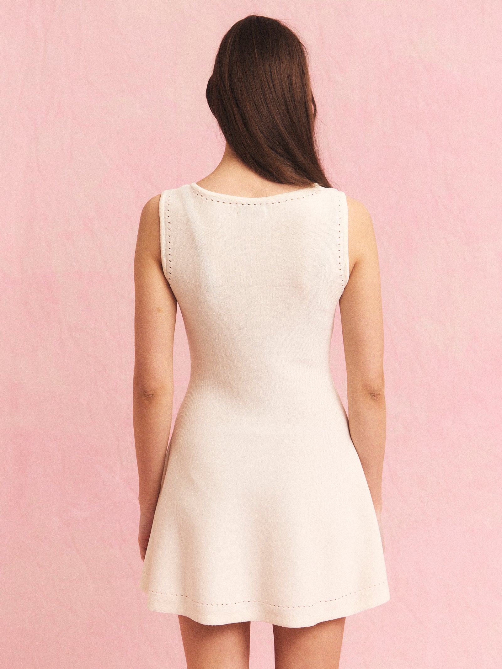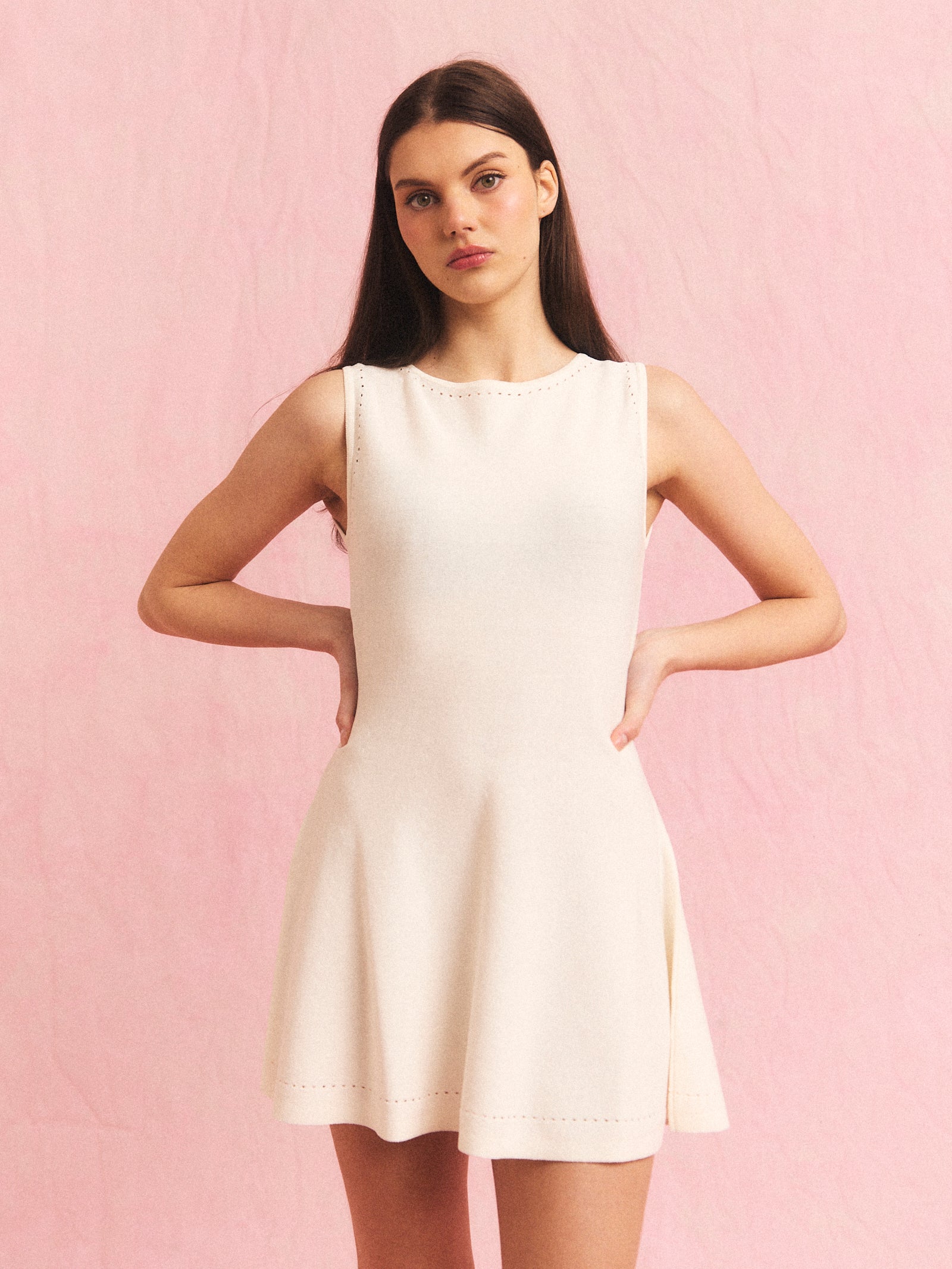 Figursydd strikkekjole med svingende skjørt og hullmønster. Myk viscose-blanding med fin fall og diskré stretch. Sitter tett i overkroppen og svinger lett rundt lårene.