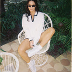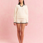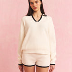 Ekstremt mykt rib-strikk loungesett i to deler – cropped V-hals genser med kontrasterende svart kant og matchende cropped shorts med samme svarte kant nederst. Sporty preppy uttrykk i mykt, tykt strikkestoff som ligger varmt mot huden uten å klø.